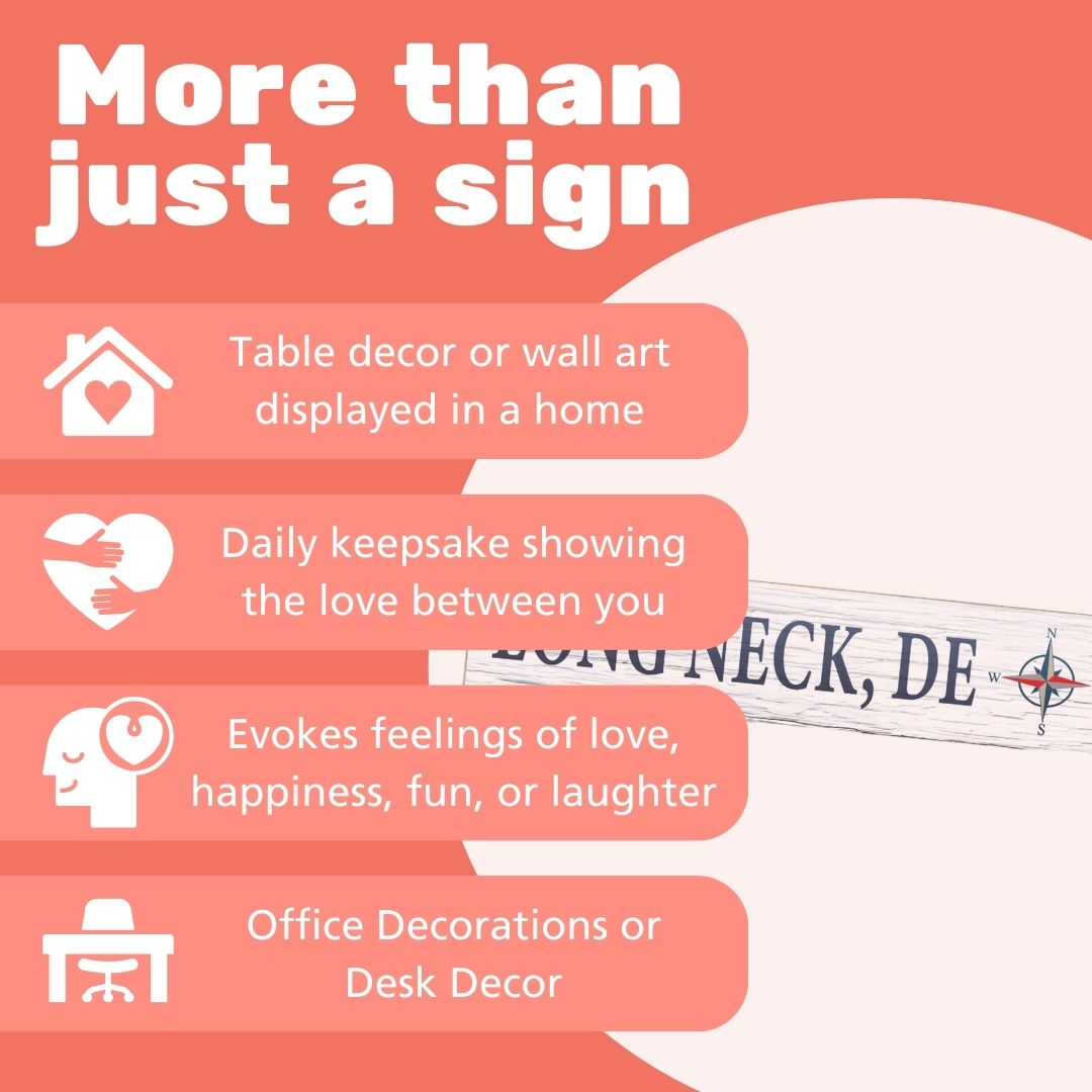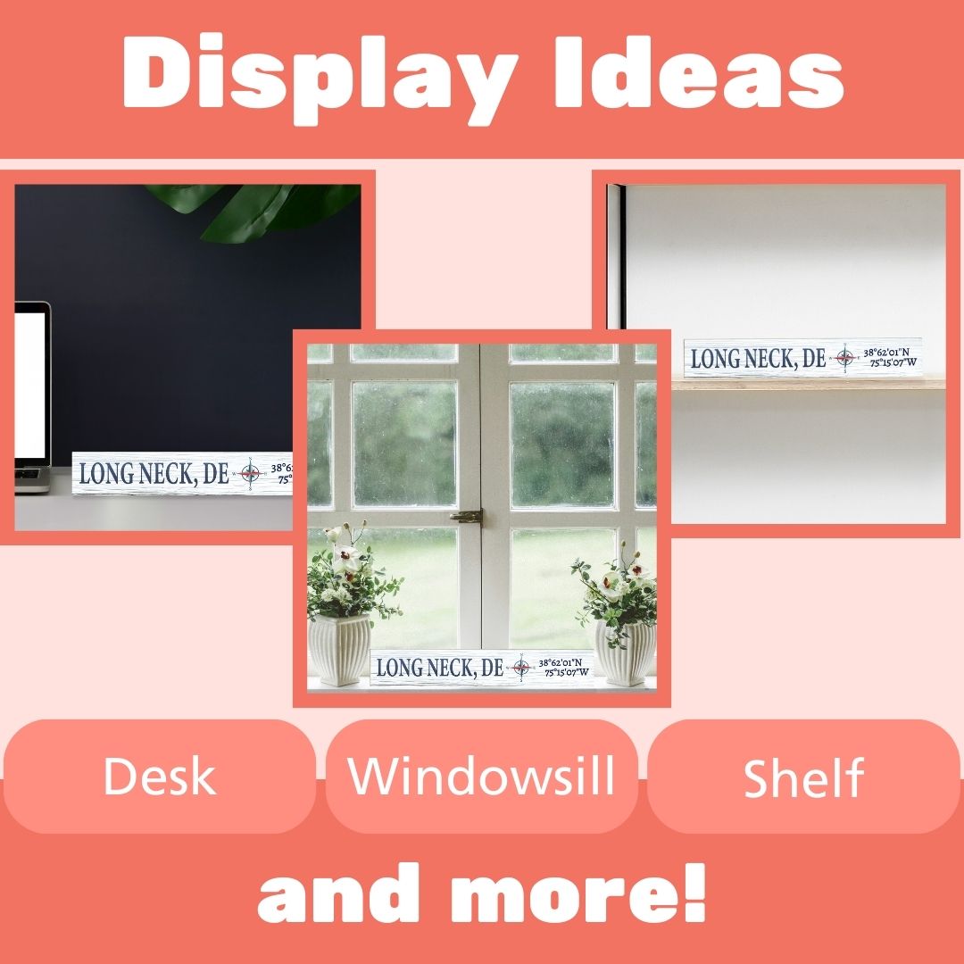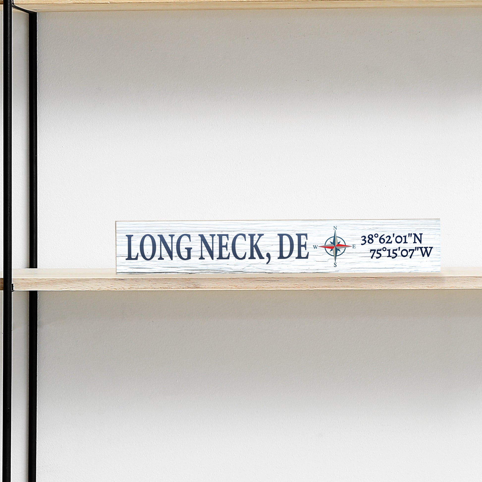 This 1-foot-long wooden sign features the Long Neck Delaware compass coordinates, crafted to sit freely on any shelf. Its precise compass design adds a sophisticated touch to your decor while celebrating local spirit. Expertly made, it combines durability with a clean, elegant look perfect for any setting.