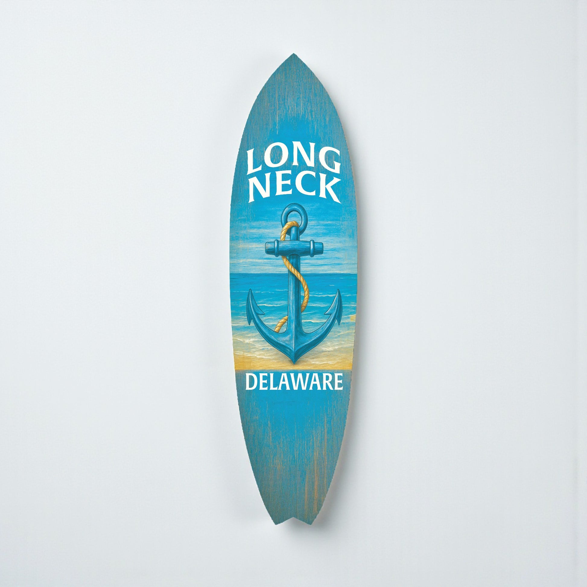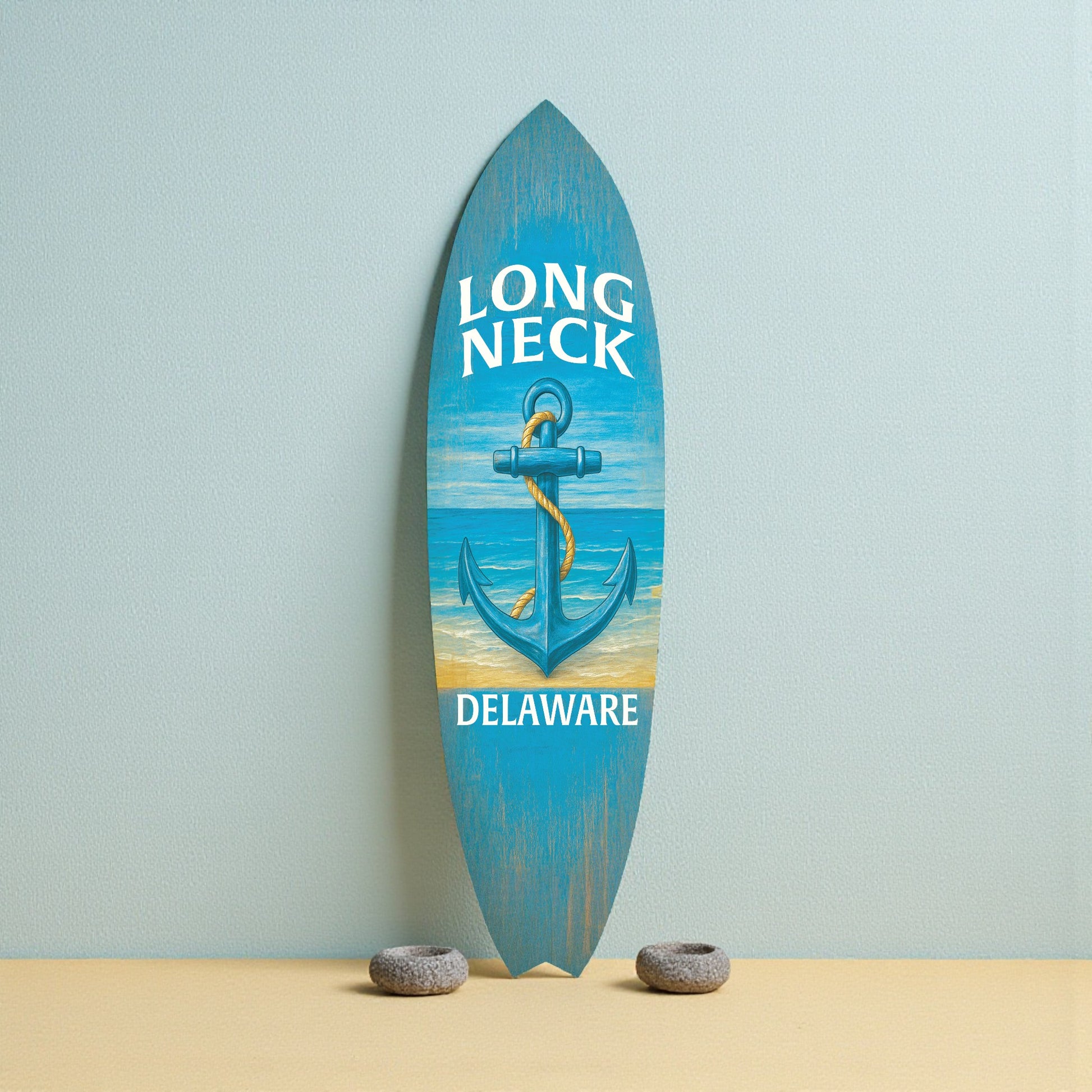 Bring coastal charm to your home with this Long Neck, Delaware surfboard sign! Featuring a weathered blue background, ocean waves, and a bold anchor design in the center, this decorative PVC surfboard captures the laid-back, nautical spirit of Delaware's waterfront lifestyle.